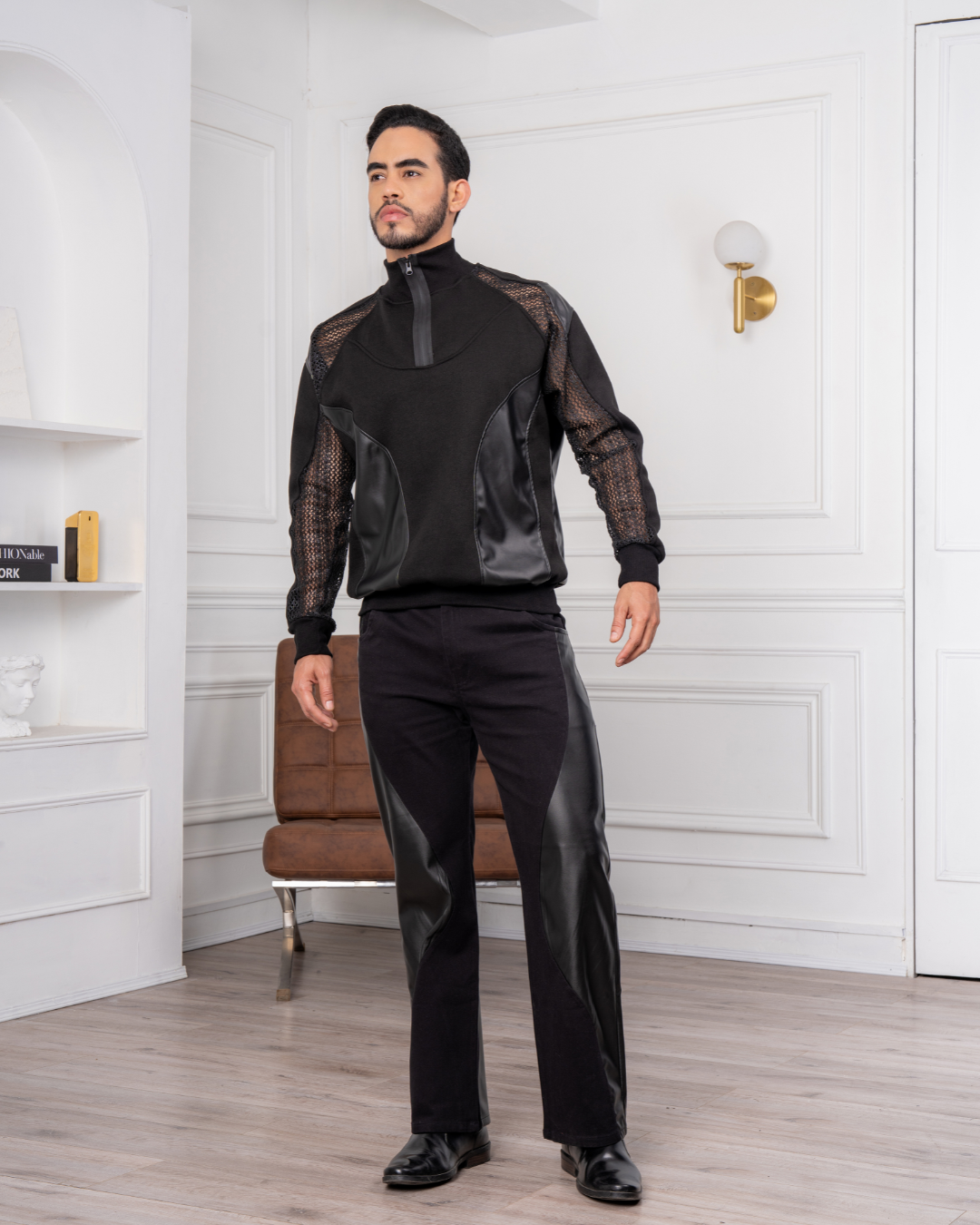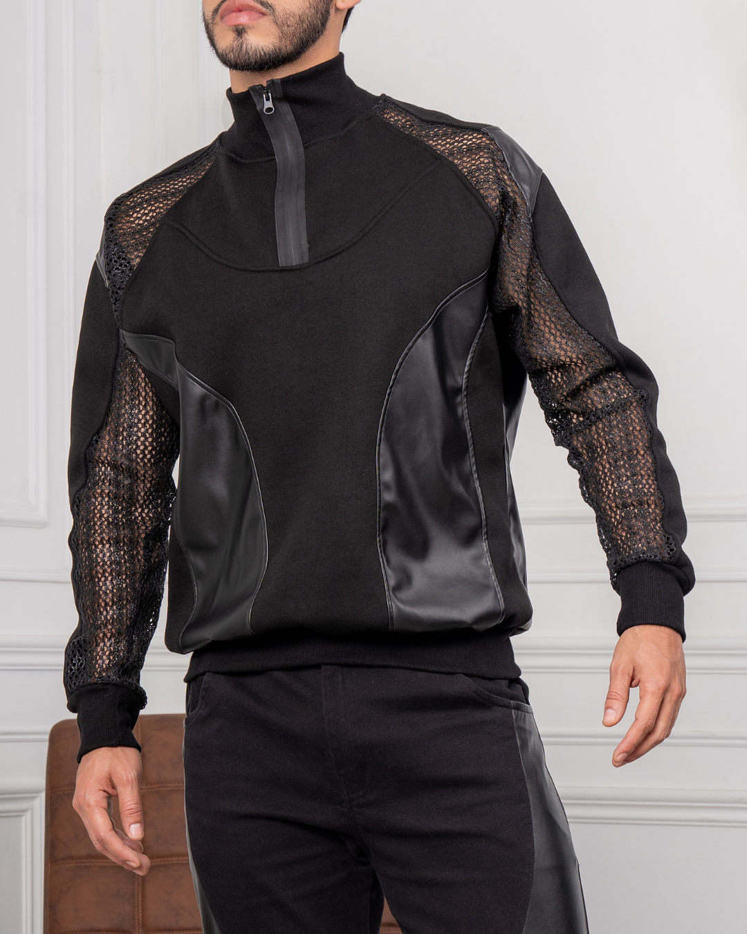 Texturas que hablan por sí solas. Malla, eco-cuero y un corte limpio para un look contemporáneo y funcional. Versátil, ligera y con carácter.